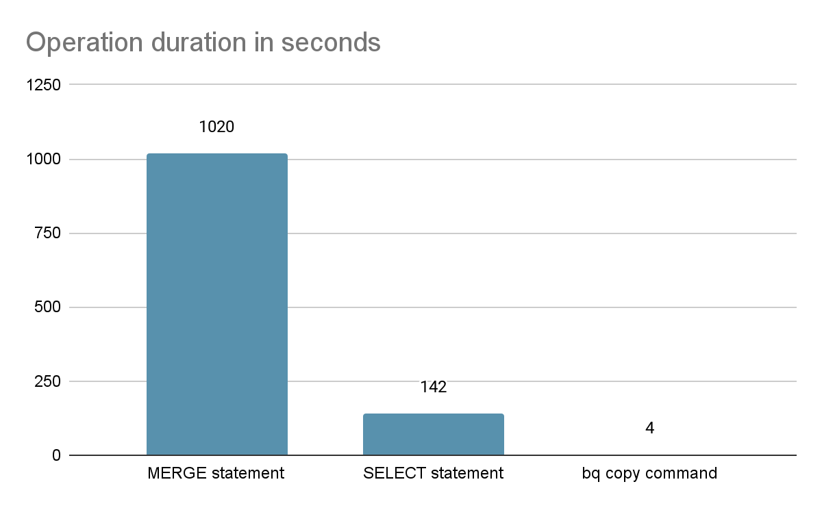 So picking the BQ copy approach is definitely a no-brainer. That’s the solution we picked to improve the BQ output on incremental materialization using the insert_overwrite strategy.